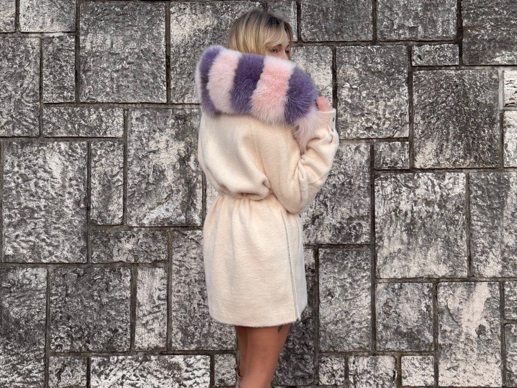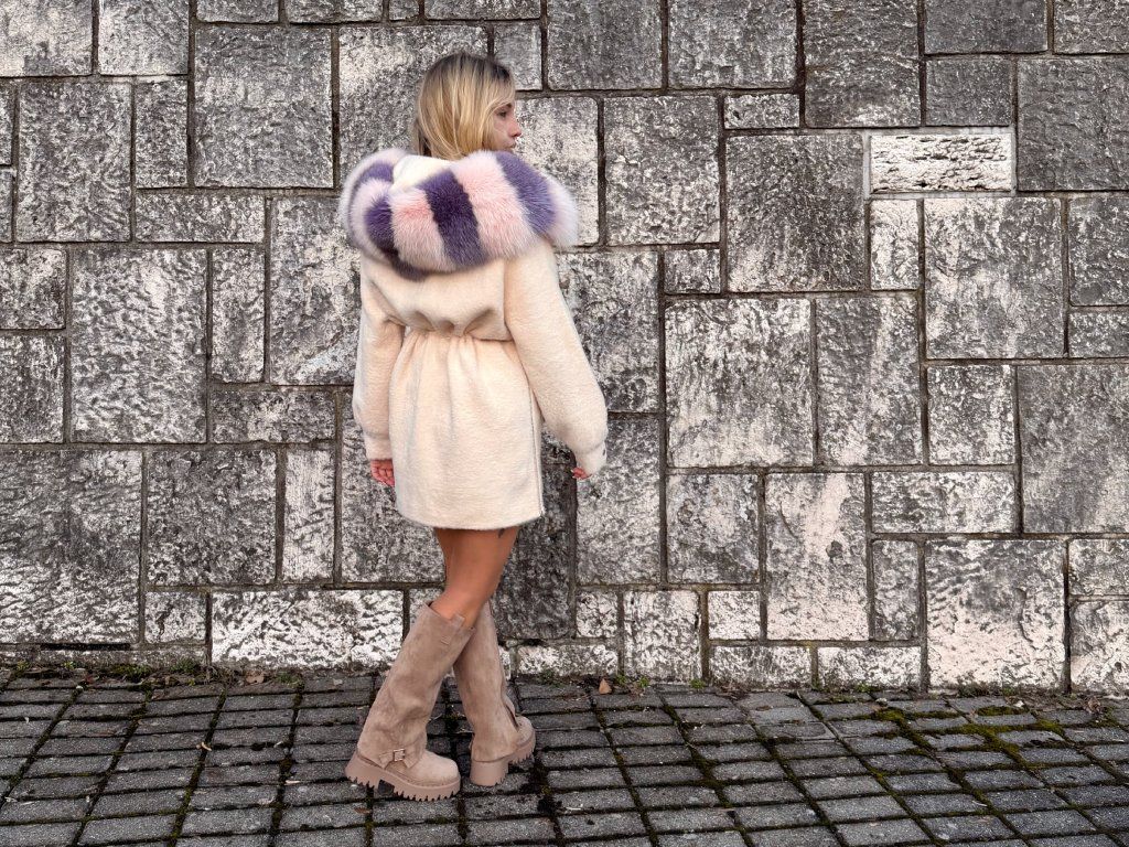 Jemná béžová alpaka vytvára elegantný základ, zatiaľ čo bohato objemná kapucňa z pravej líšky v pastelovej kombinácii dodáva modelu luxusný a fashion charakter.