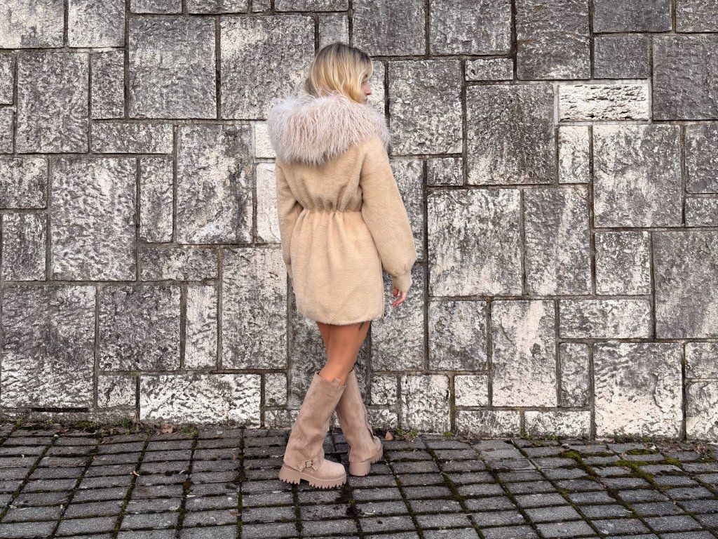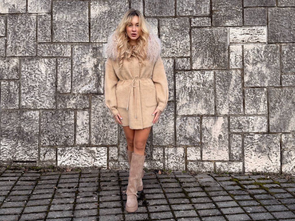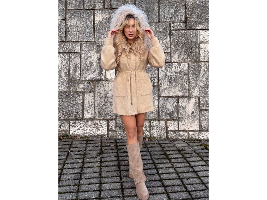Ľahká alpaka je ideálna na jar a jeseň – poskytuje komfort, priedušnosť a prirodzenú termoreguláciu. Výrazná kapucňa z pravej lamy dodáva modelu luxusný objem a exkluzívny vzhľad.
