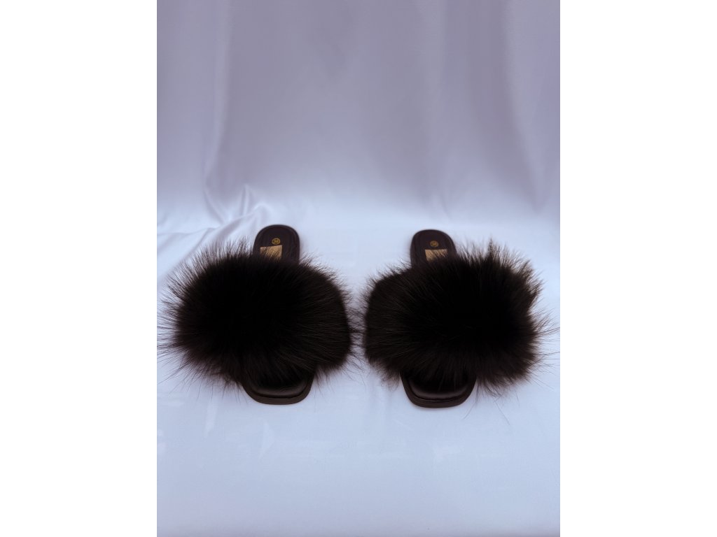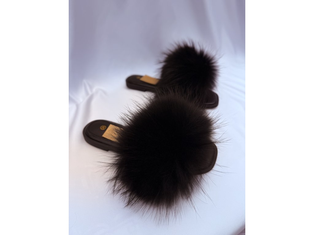 Elegantné kožené šľapky s luxusnou kožušinou z mývala v hlbokej čiernej farbe. Minimalistický dizajn, ktorý sa hodí ku každému outfitu – či už k džínsom alebo letným šatám.