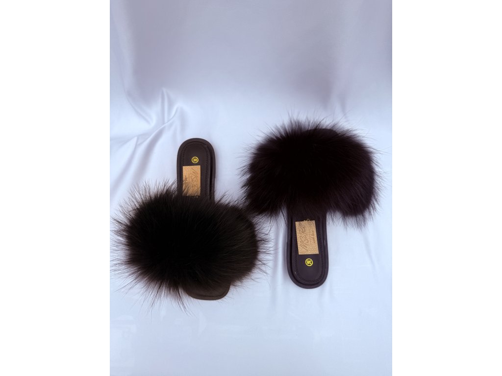 Názov produktu: Ebony Raccoon Leather Slides – luxusné kožené šľapky z mývala Kožušina: black raccoon Saga FursStielka: kvalitná kožaPodrážka: pevná, pohodlnáFarba: čiernaVeľkosti: 36 – 41