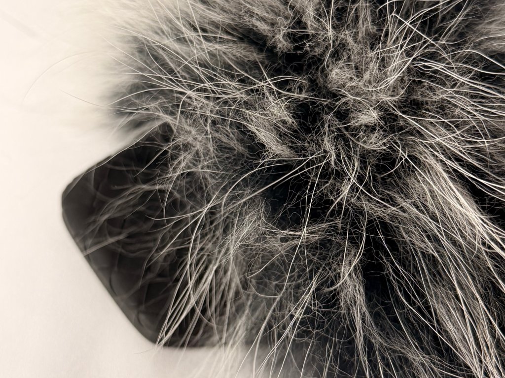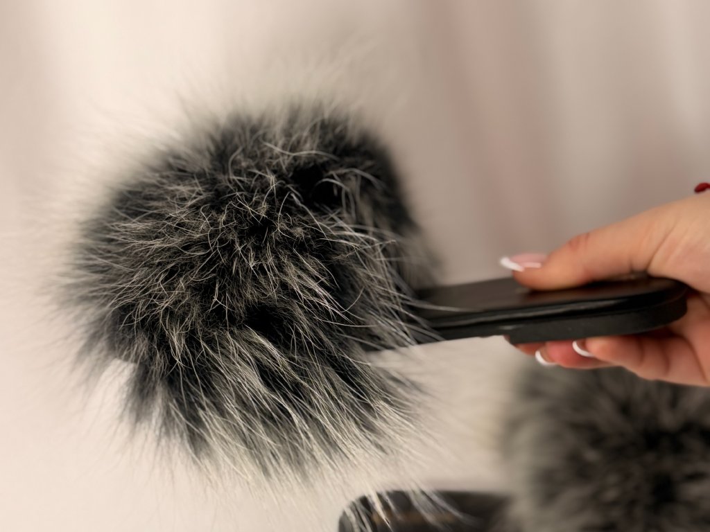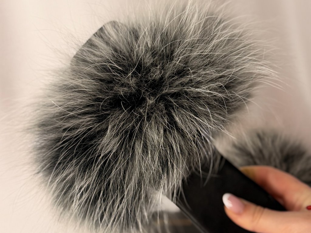 Nízke kožené šľapky zdobené bohatou pravou kožušinou v elegantnom odtieni Silver Fox (čierno-strieborno-sivá kombinácia). Kožušina je hustá, nadýchaná a krásne drží objem.