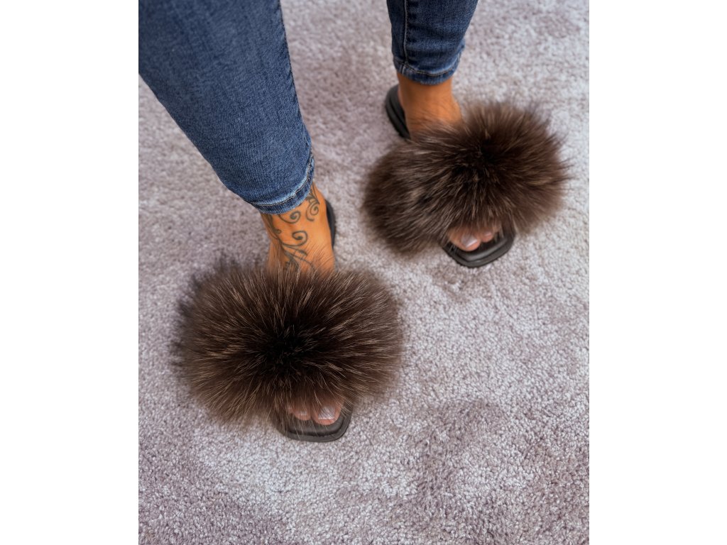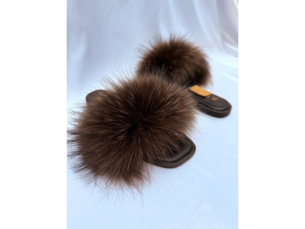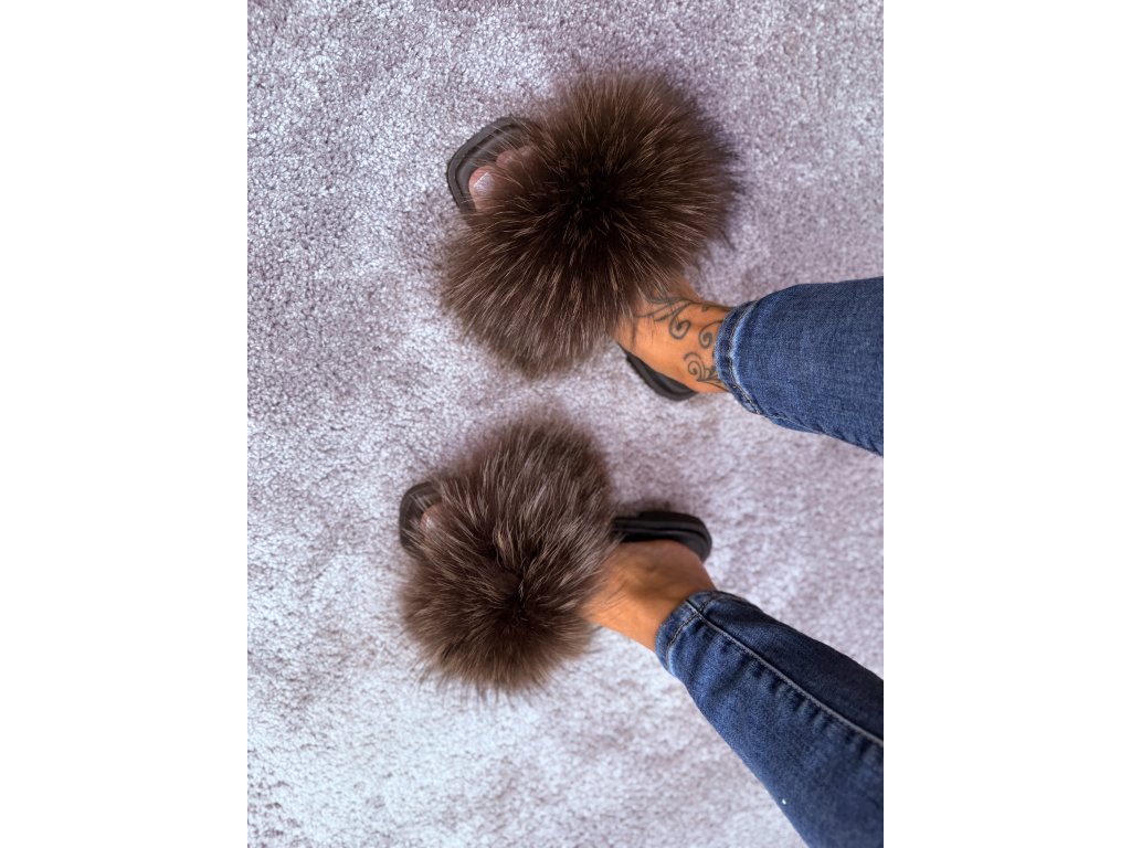 Kožušinové šľapky s čokoládovým mývalom a koženou výstielkou – nízky model