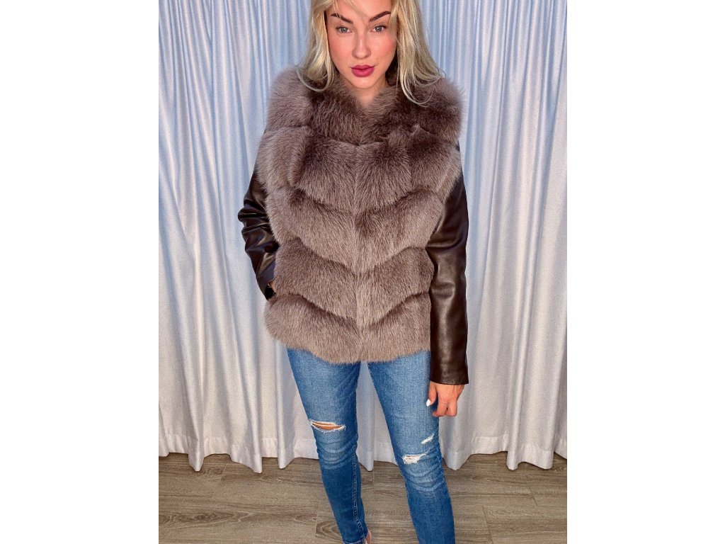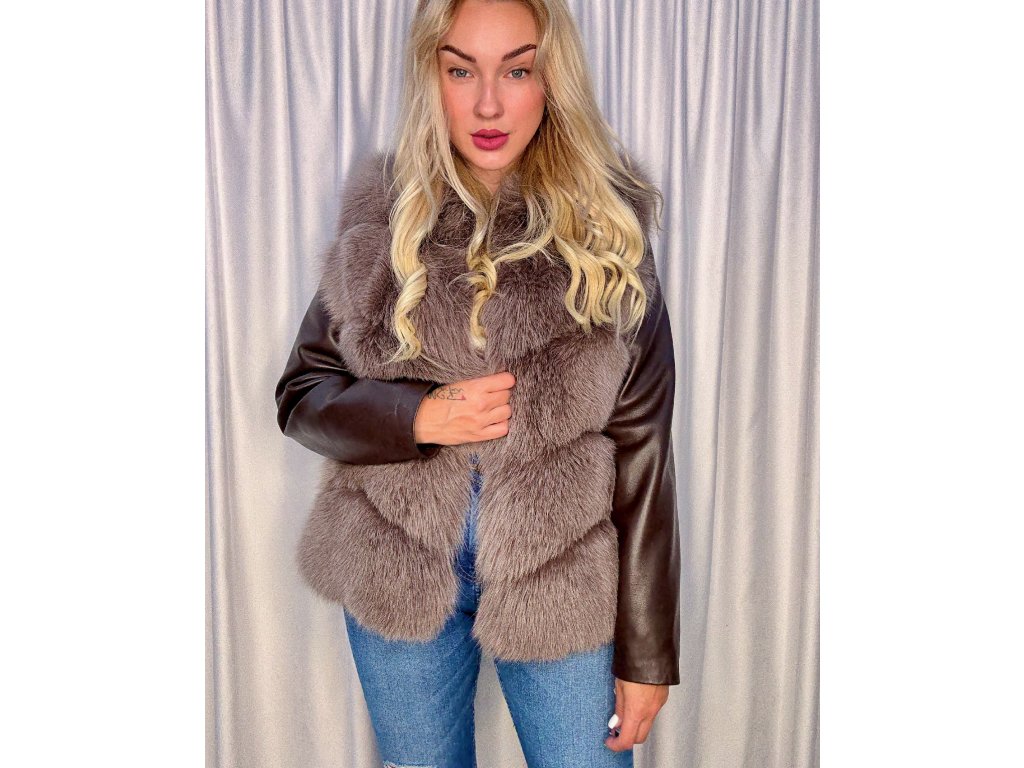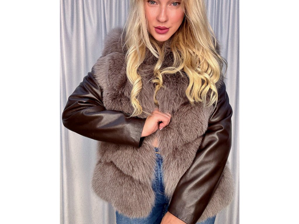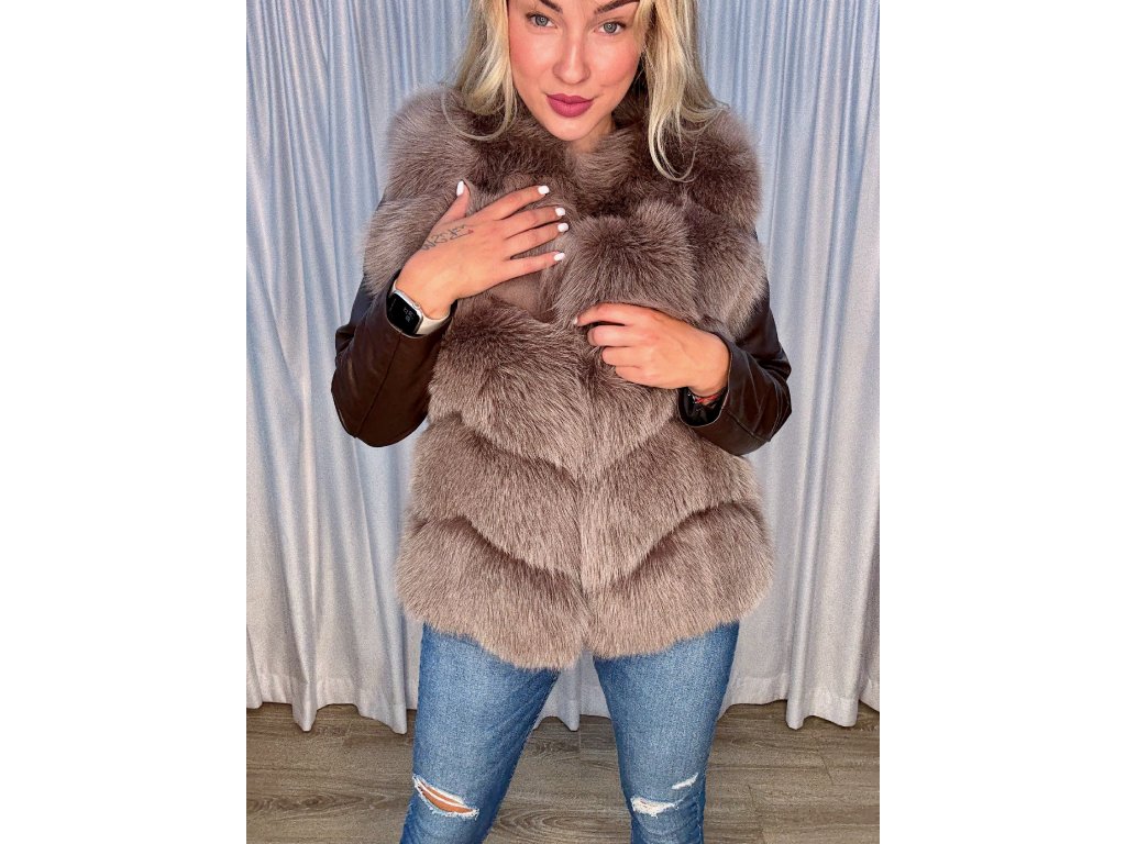 ✨ Výpredaj – posledný kus!Exkluzívna vesta z mokka kožušiny s kontrastnými koženými rukávmi na zips. Moderný strih, luxusný vzhľad a pohodlné nosenie v jednom.