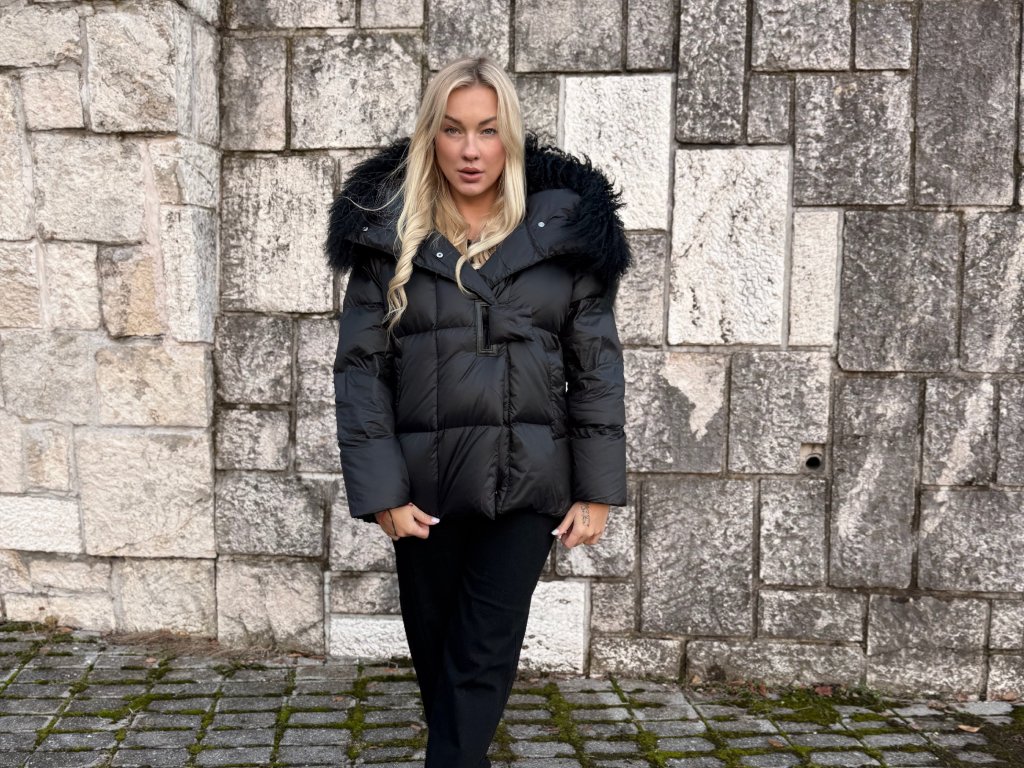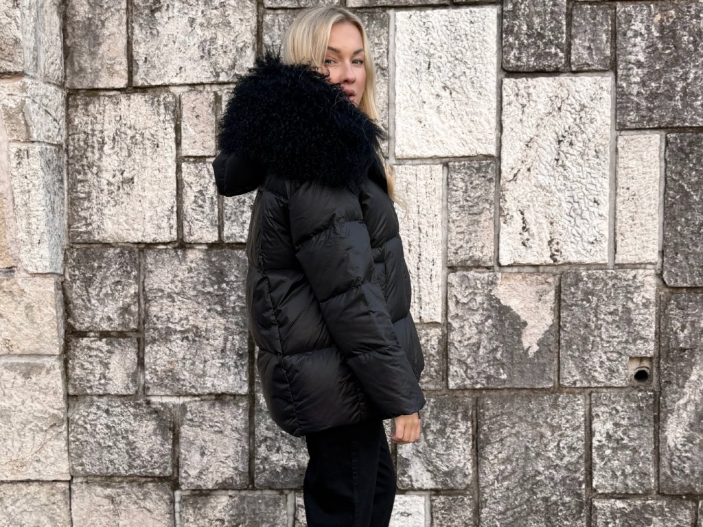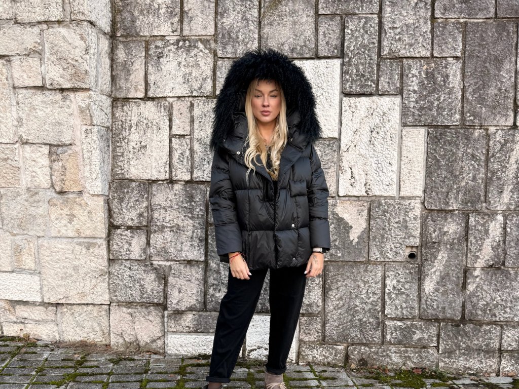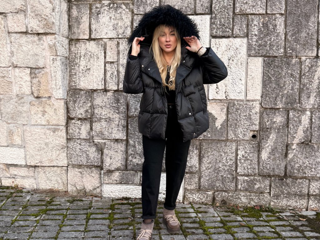 Elegantná páperová bunda so zapínaním na magnety a clip spony, vďaka ktorým sa nosí mimoriadne pohodlne.Model s bohatým lemovaním z čiernej prírodnej lamy pôsobí noblesne a zároveň ležérne – ideálny na bežné nosenie aj do mesta.Strih jemne rozšírený, univerzálna veľkosť vhodná od S po XL.