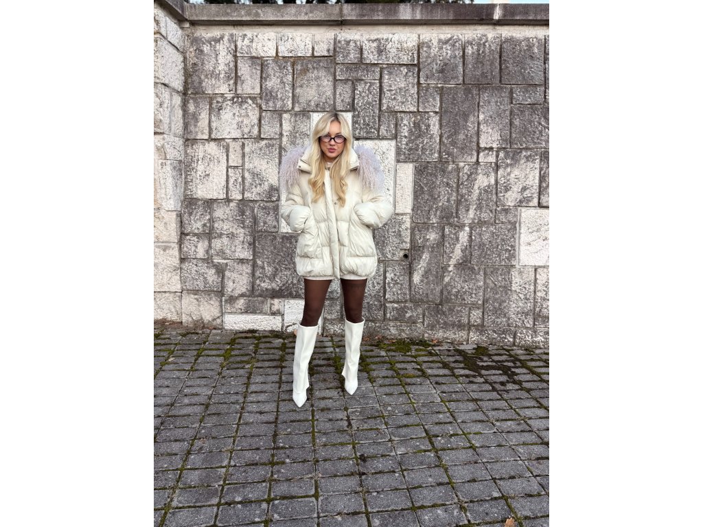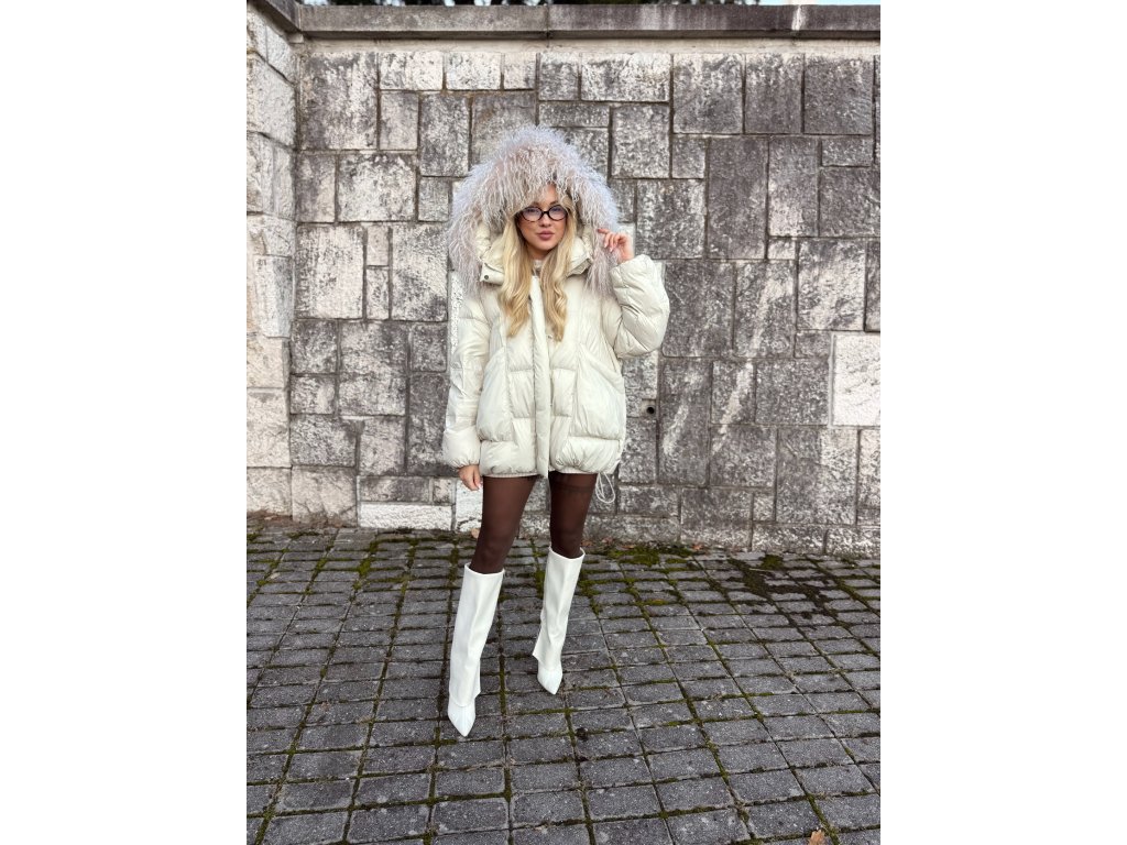 Exkluzívna krátka bunda s prírodnou lamou v odtieni ivory.Model s výplňou z husieho peria je neuveriteľne ľahký, ale zároveň hrejivý.Vďaka svojmu oversize strihu ONE SIZE je vhodná pre veľkosti S–L.Luxusný doplnok zimného šatníka, ktorý sa skvelo kombinuje s čižmami aj džínsami.
