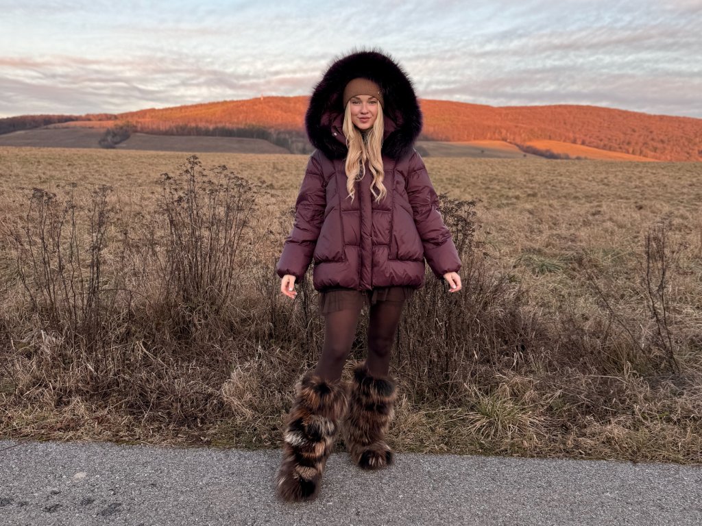 Kapucňa je bohato zdobená prírodným mývalom v slivkovom tóne tón v tóne, čo vytvára harmonický a veľmi elegantný vzhľad bez výrazných kontrastov. Tento detail robí bundu univerzálnou a ľahko kombinovateľnou.
