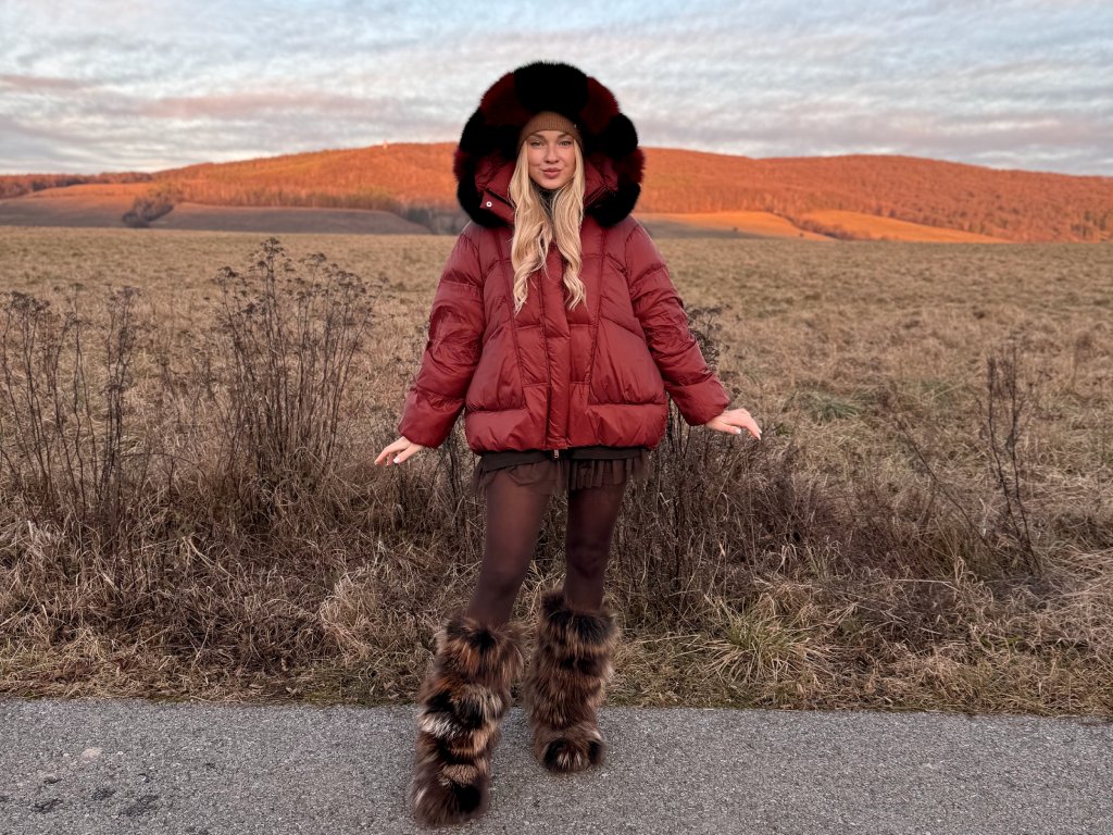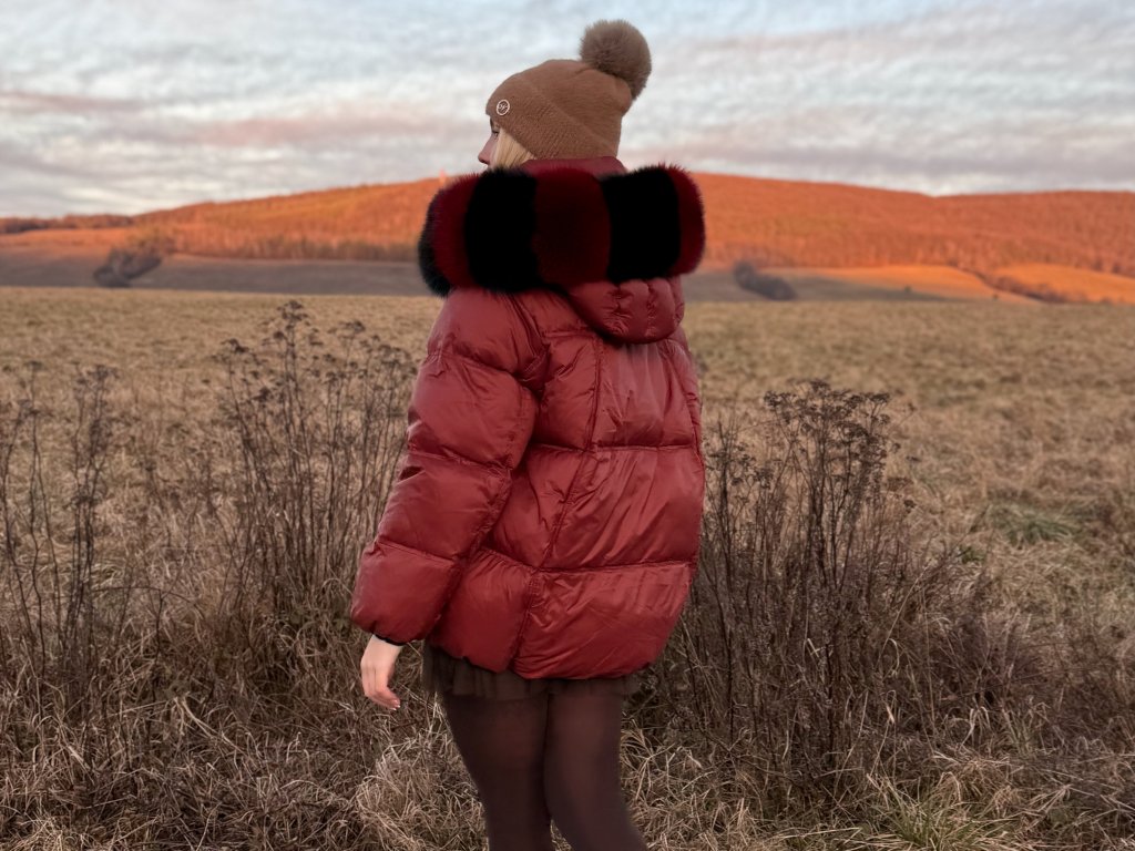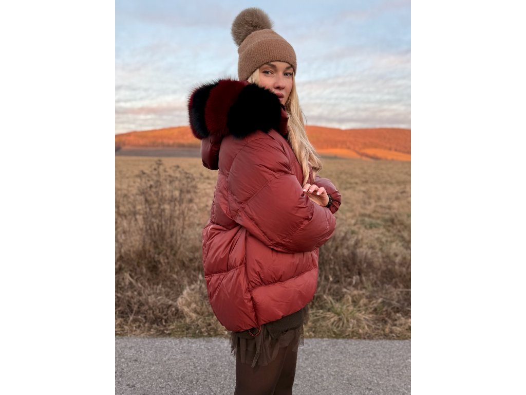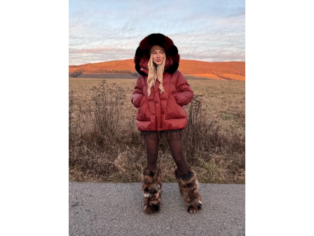 Hlavným dizajnovým prvkom je kožušina z líšky v kombinácii čiernej a červenej farby, ktorá krásne kontrastuje s tehlovým základom bundy. Bohatá kožušina dodáva modelu luxusný charakter a zároveň chráni pred chladom a vetrom.