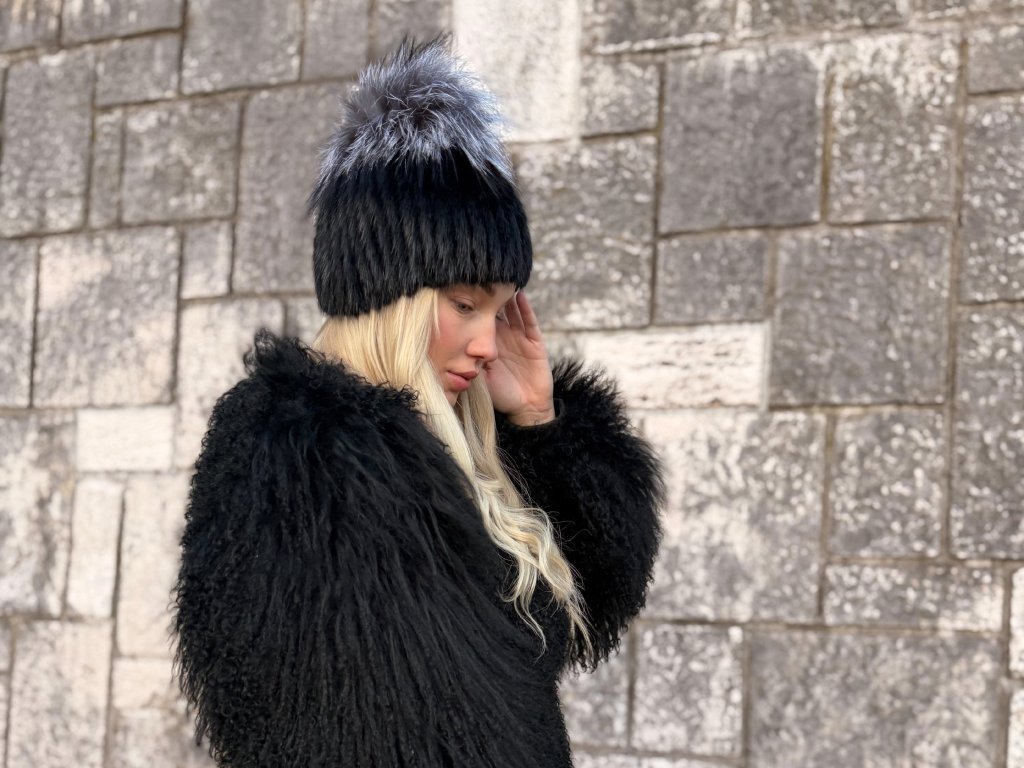 Elegantná čiapka z pravej norky zdobená luxusnou kožušinou zo striebornej . Nadčasový doplnok, ktorý dodá zimnému outfitu exkluzívny charakter a výrazný štýl.
