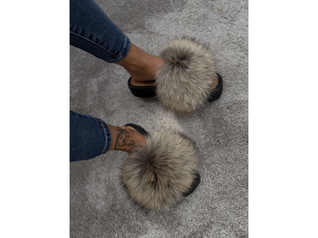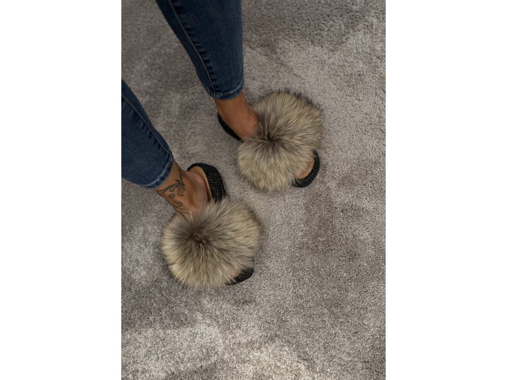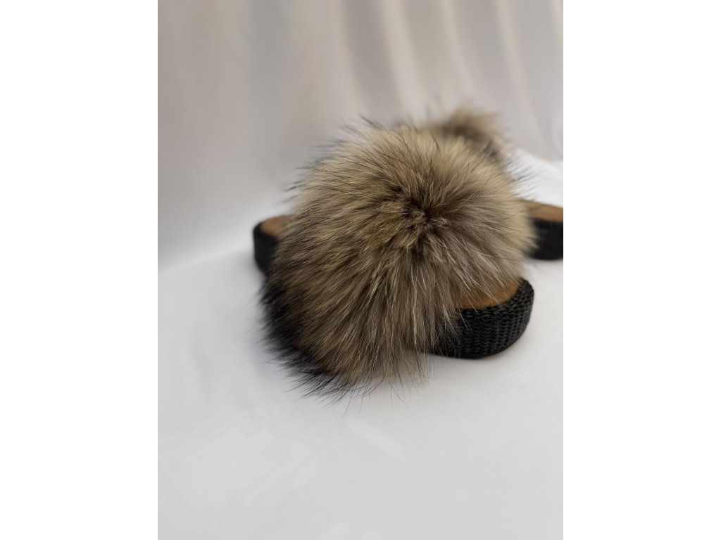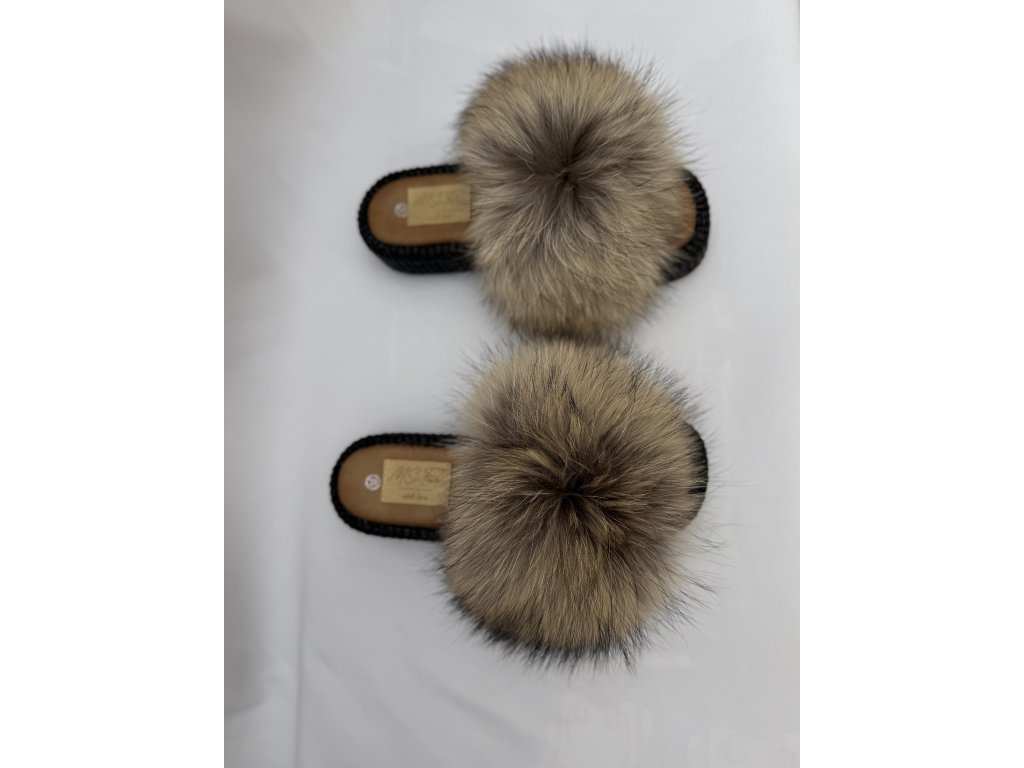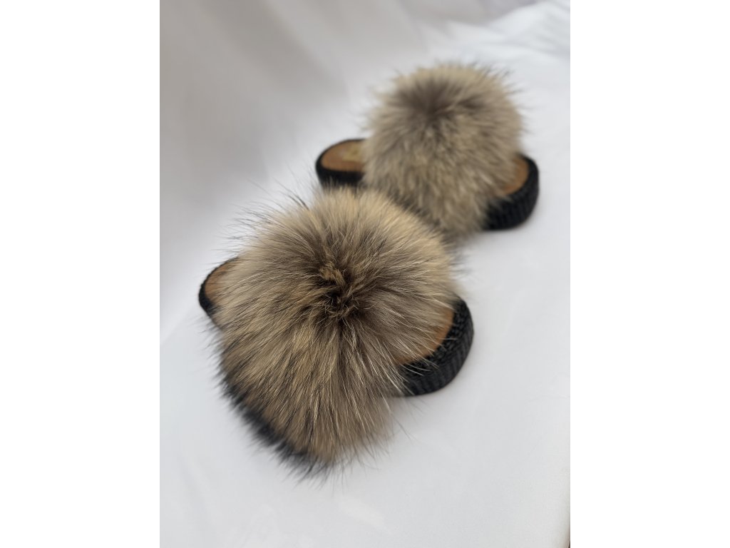 Limitovaná edícia šľapiek s kožušinou z mývala v prírodných tónoch.
